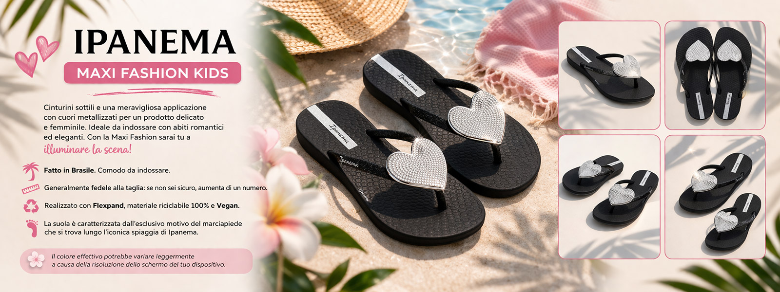 Le Ipanema Maxi Fashion Kids sono il perfetto equilibrio tra stile e comfort, pensate per le bambine che amano un look delicato e raffinato. I cinturini sottili valorizzano il piede, mentre l’applicazione con cuori metallizzati aggiunge un tocco luminoso e glamour, ideale per completare outfit eleganti e romantici.